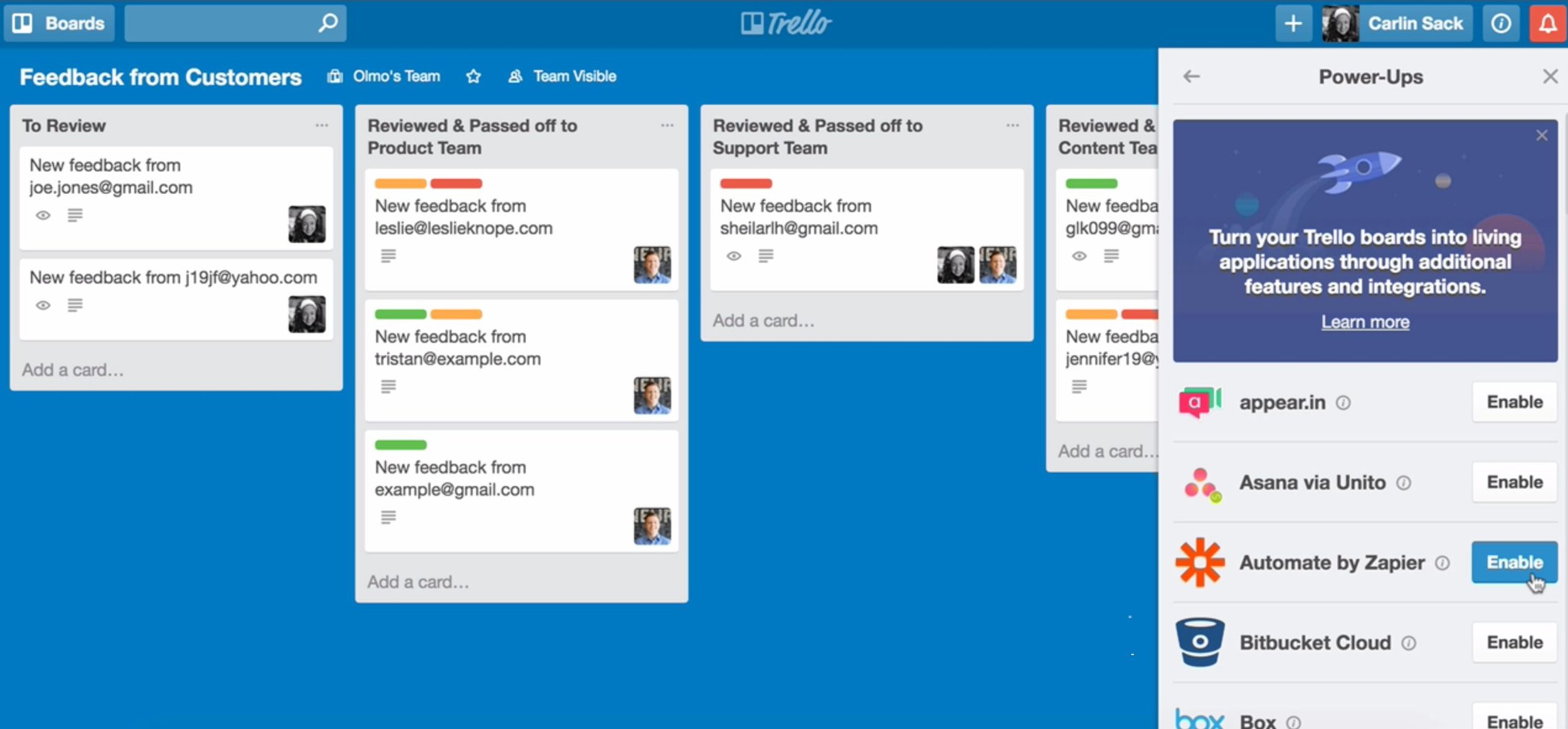 Trello is a digital Kanban board: each column is a step (Lead, Quote Sent, Client, etc.) and each card is a customer. or client You drag a card to the next column when that step is complete. Paired with a few simple automations, Trello can fill in custom fields, send documents, and update teammates the moment you move a card—no complicated software or coding required.